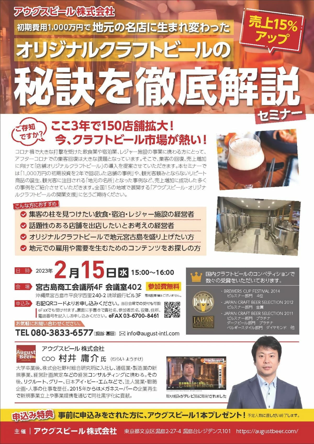 アウグスビール株式会社(東京都文京区)は、2月15日(水曜日)に宮古島商工会議所にて小規模クラフトビール工場(マイクロブルワリー)導入事例説明会を開催する。(事業者向け)