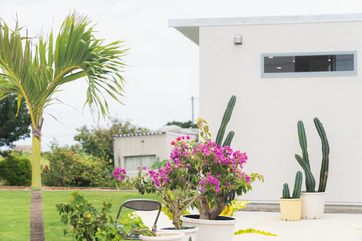 南国の植物や、芝生の綺麗なお庭のある素敵な店舗です。