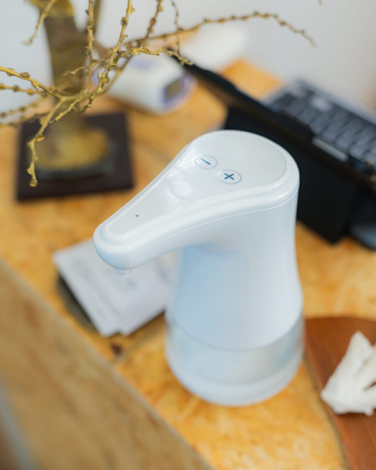 流木に電球がぶら下がっているおしゃれな受付。