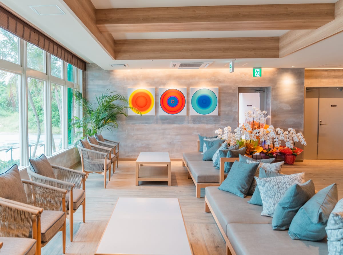 エントランスロビーはシンプルモダンなインテリアでまとめられ、カジュアルながらも洗練された空間が広がります。