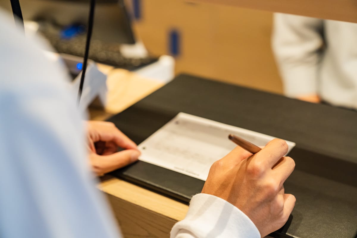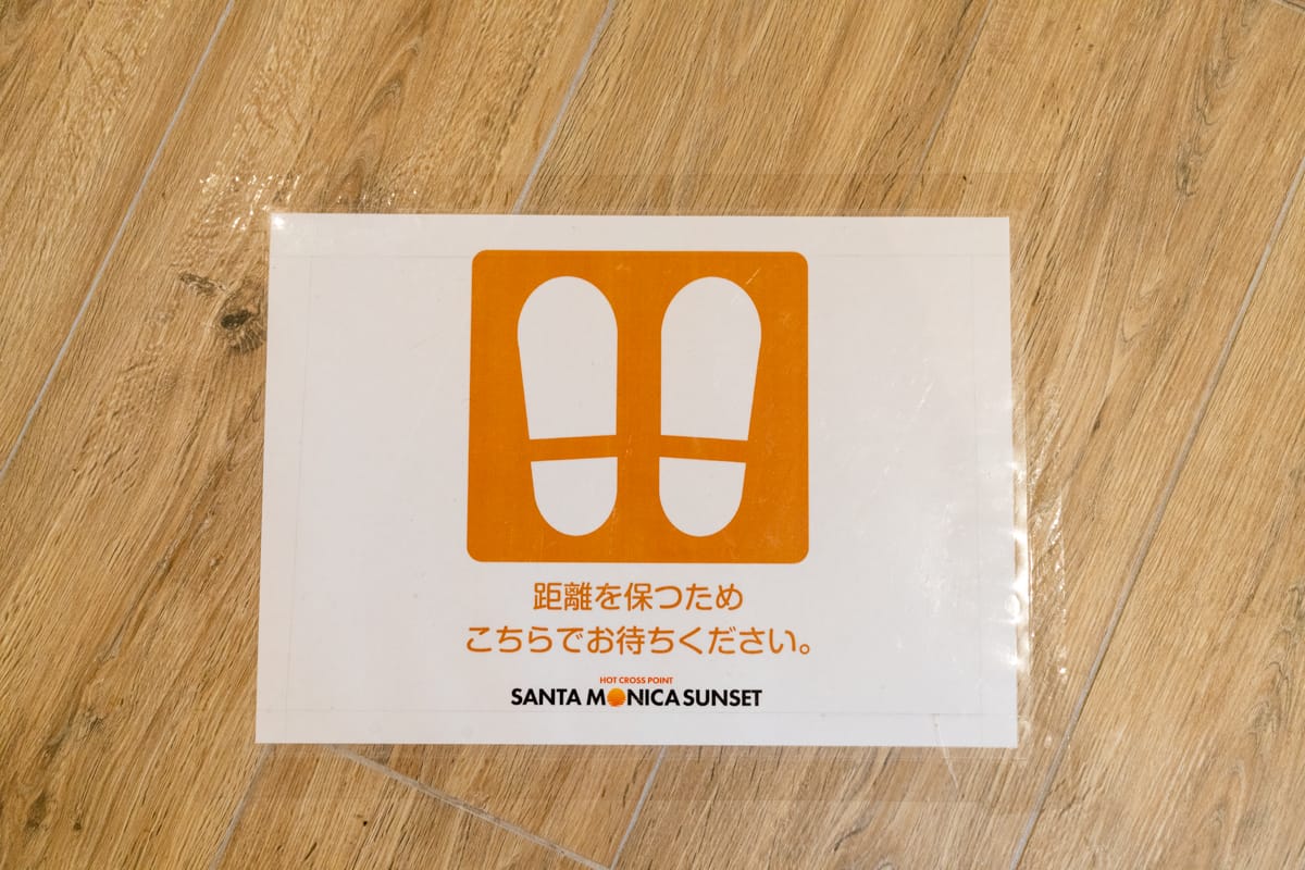 フロントカウンターの手前にはソーシャルディスタンスを図るための順番待ちラインが引かれています。前に他のお客様がいるときはここで待ちます。