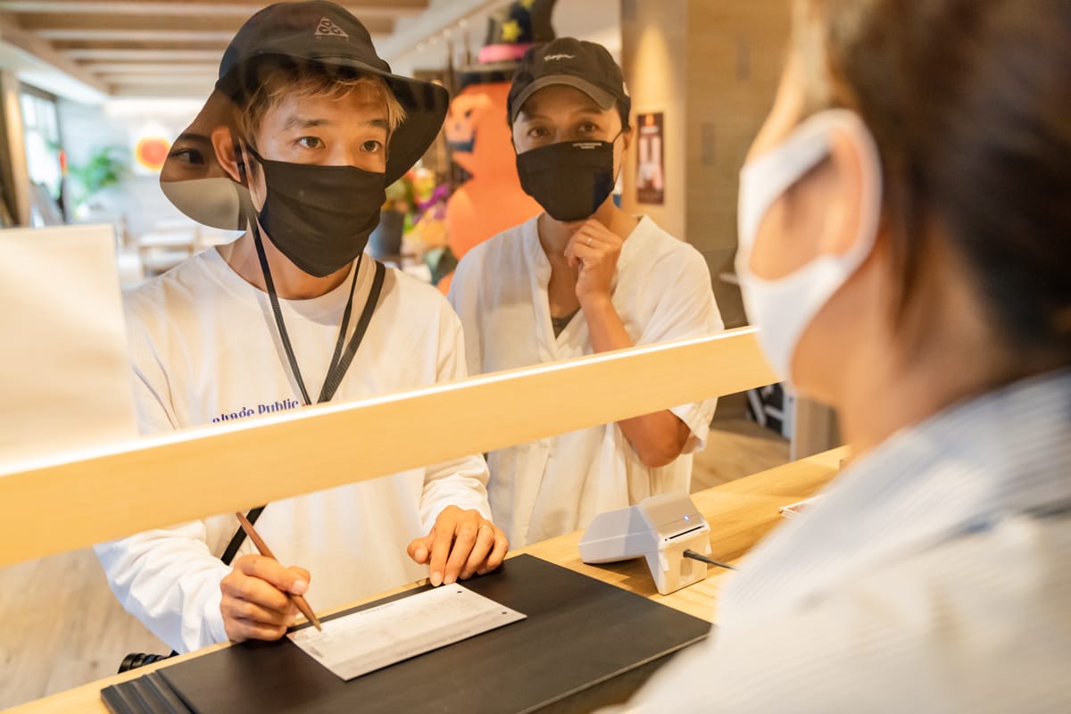カウンターにも飛沫感染防止用パネルが置かれ、対策がしっかりとなされています。