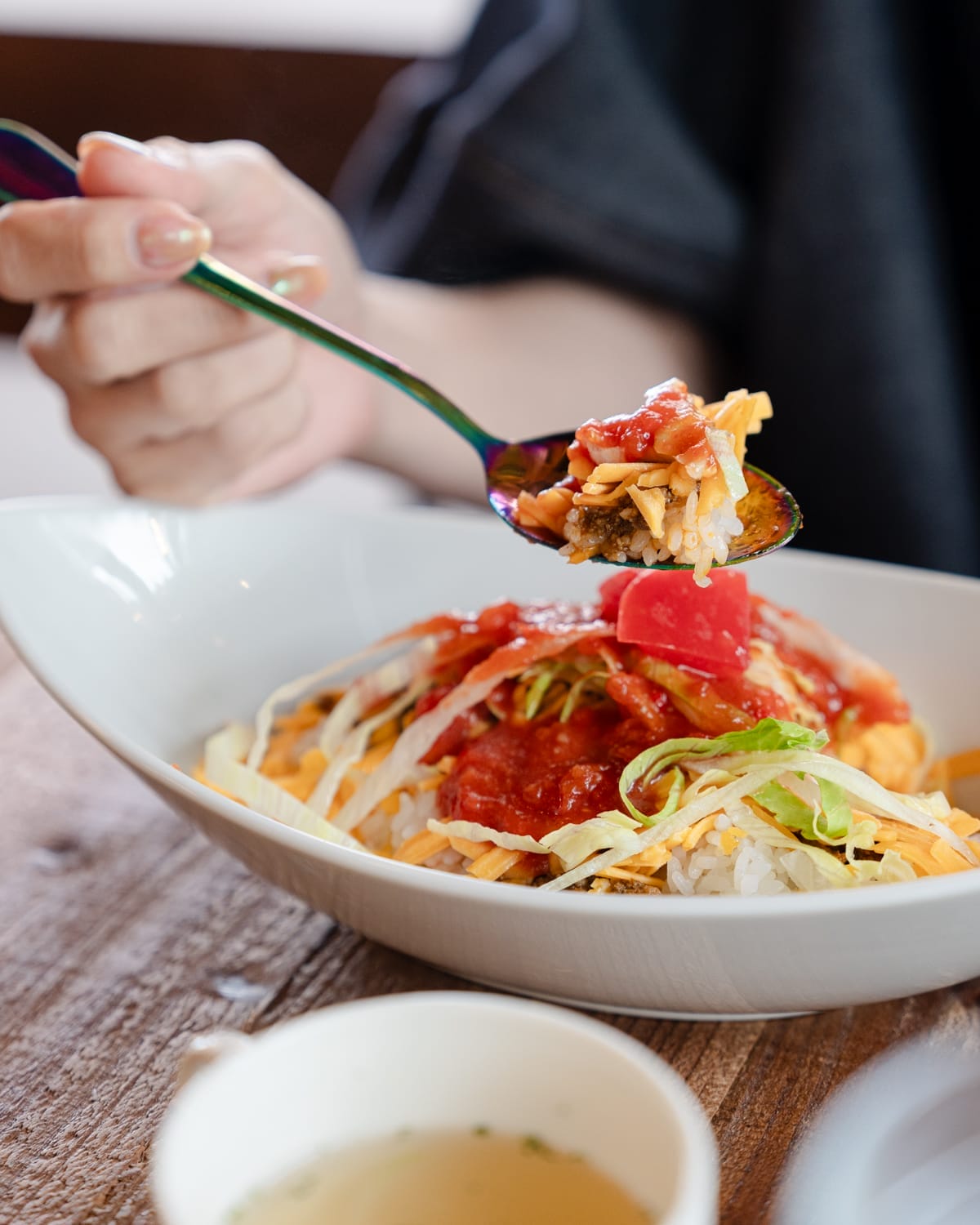 見た目はとてもシンプル。ごはんの上にタコミート、レタス、チーズ、トマト、そしてサルサソースがのった、まさに“王道スタイル”のタコライスです。味も期待を裏切らないベーシックな仕上がりで、派手さはありませんが、安定感のある味わいで、誰でも安心して楽しめる一品です。セットでスープがついてくるのも嬉しいポイント。