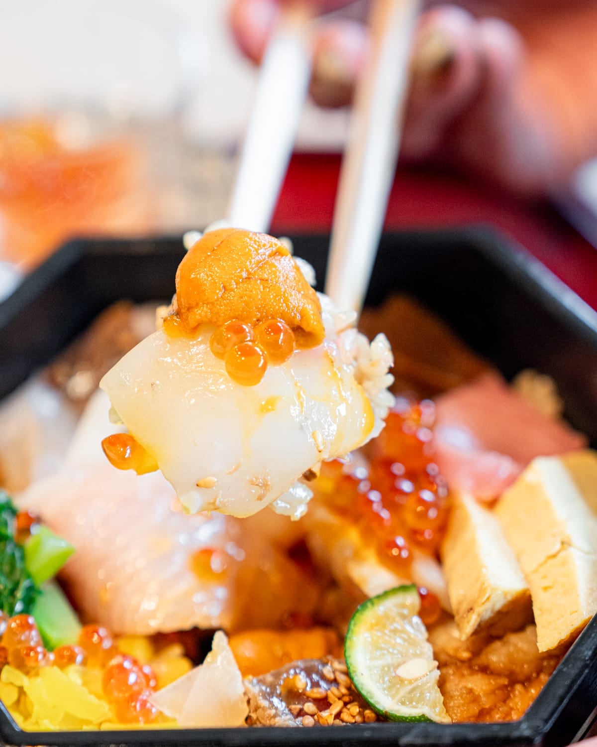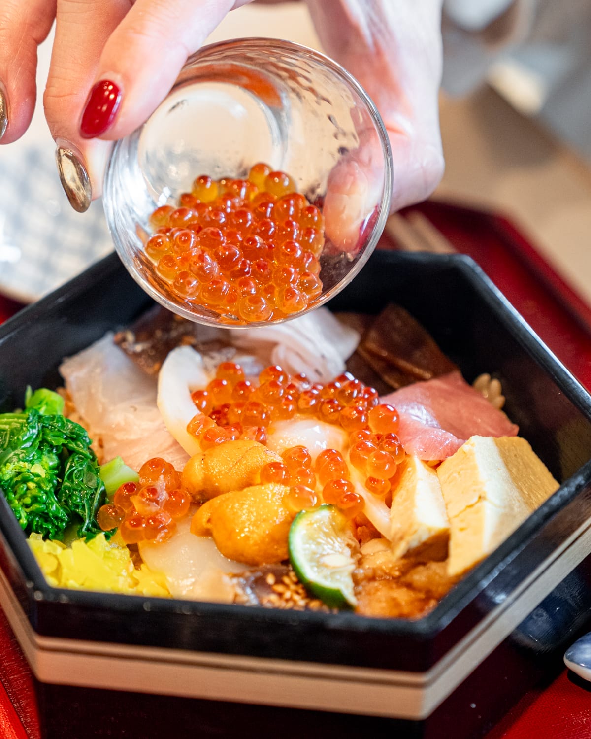 贅沢にのせた雲丹をシャリと混ぜ合わせ、さらに贅沢にイクラをたっぷりと乗せちゃった小丼。