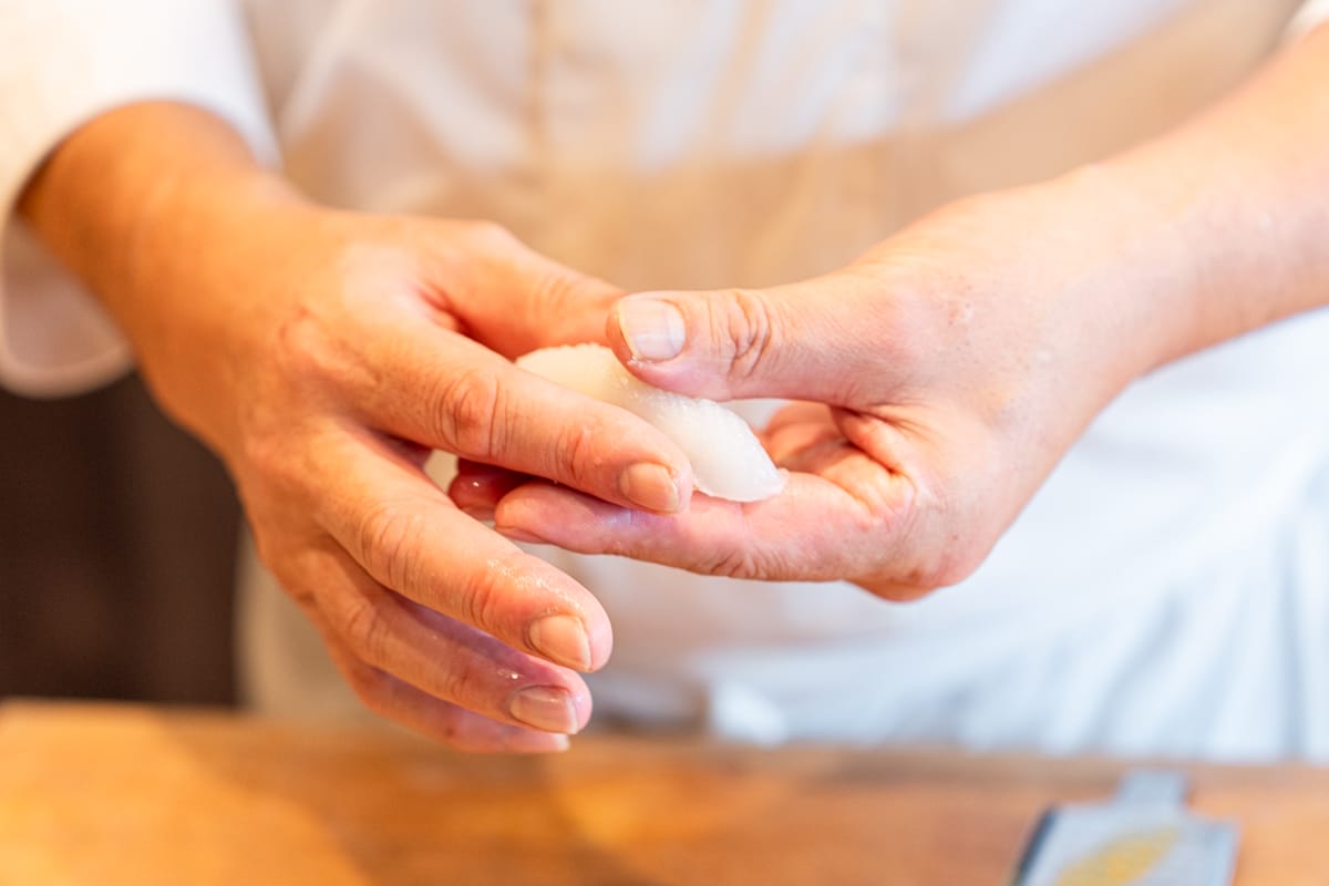 職人の手で丁寧に仕上げられたホタテは、ふっくらとした厚みと、透き通るような美しい白さが印象的。口に運べば、その瞬間、まるで雪解けのようにすっととろける…。