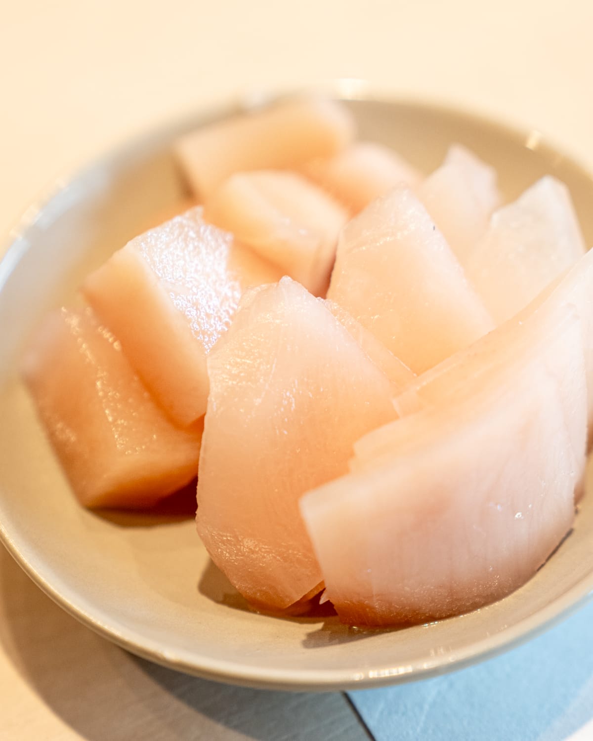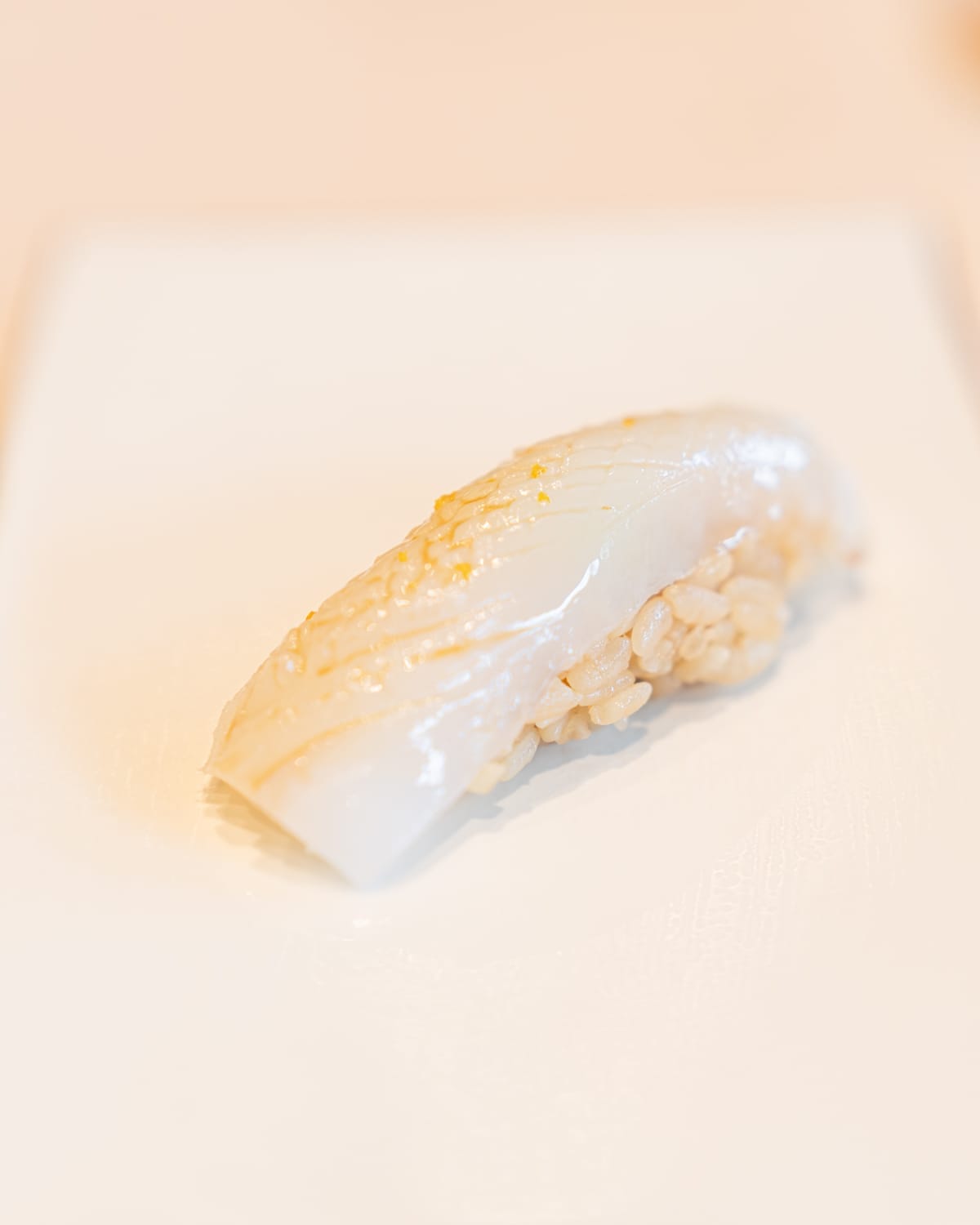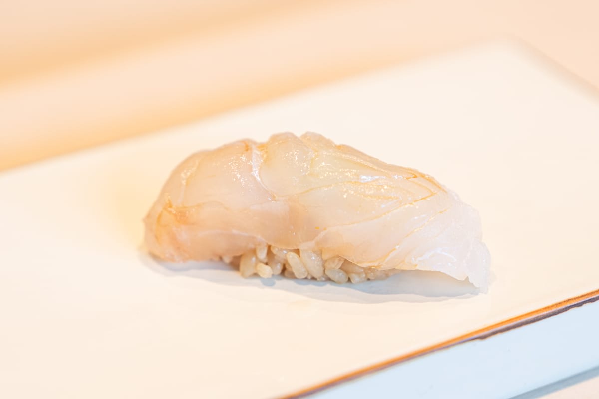 味わいは非常に繊細で、ほのかな甘みと旨味が絶妙なバランスで調和しています。さらに、赤酢を使ったシャリがミーバイの風味を一層引き立て、食感も絶妙です。すだちの香りがほんのり漂い、爽やかなアクセントを加えています。