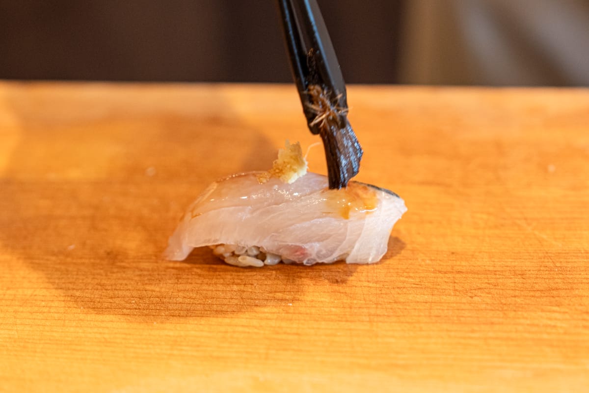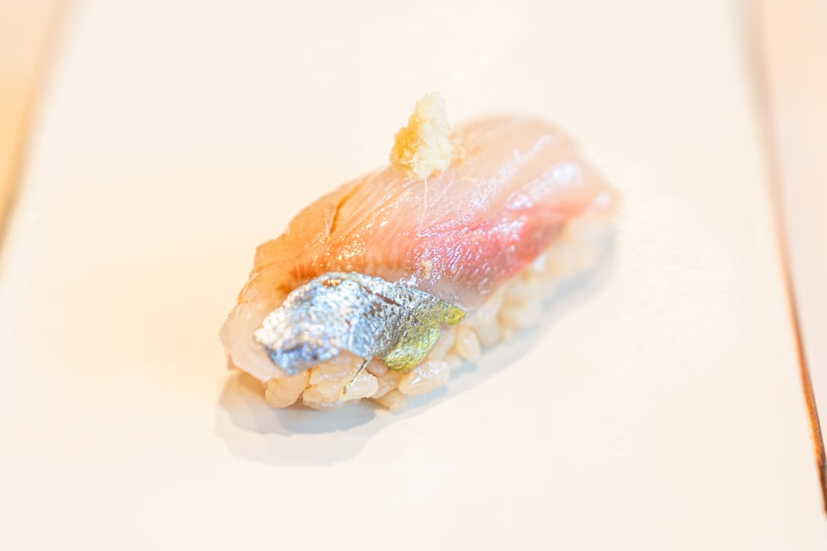 縞鯵の握りはその美しい光沢と鮮やかな縞模様が特徴で、見た目からして新鮮さが伝わってきます。そのせいか、爽やかな海の香りが感じるんです。脂も程よく乗っており、満足感が高い一貫ですね。