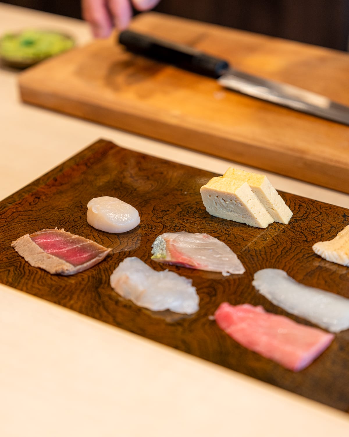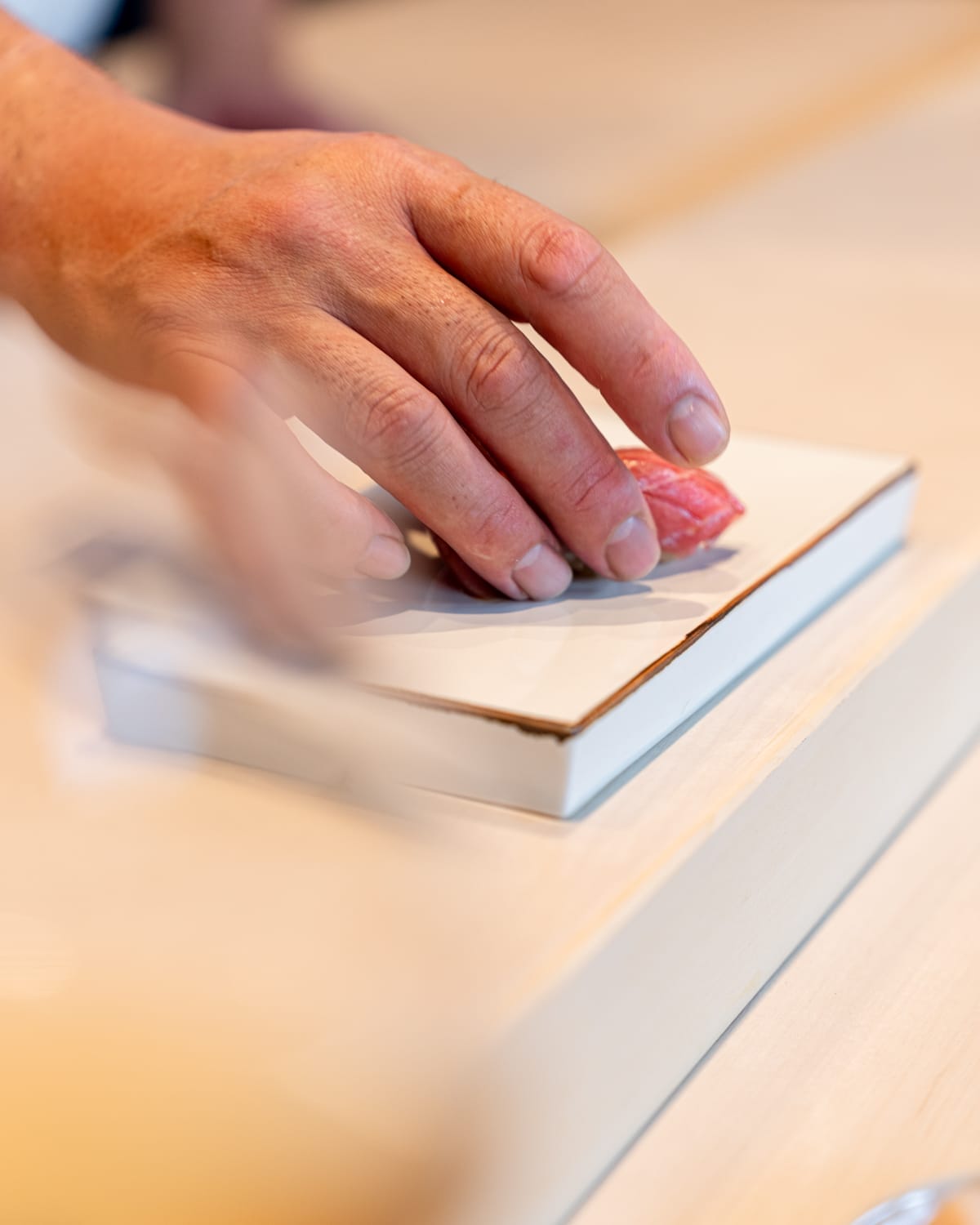 目の前に置かれた瞬間、脂がのったトロのピンクがかった輝きに目を奪われます。