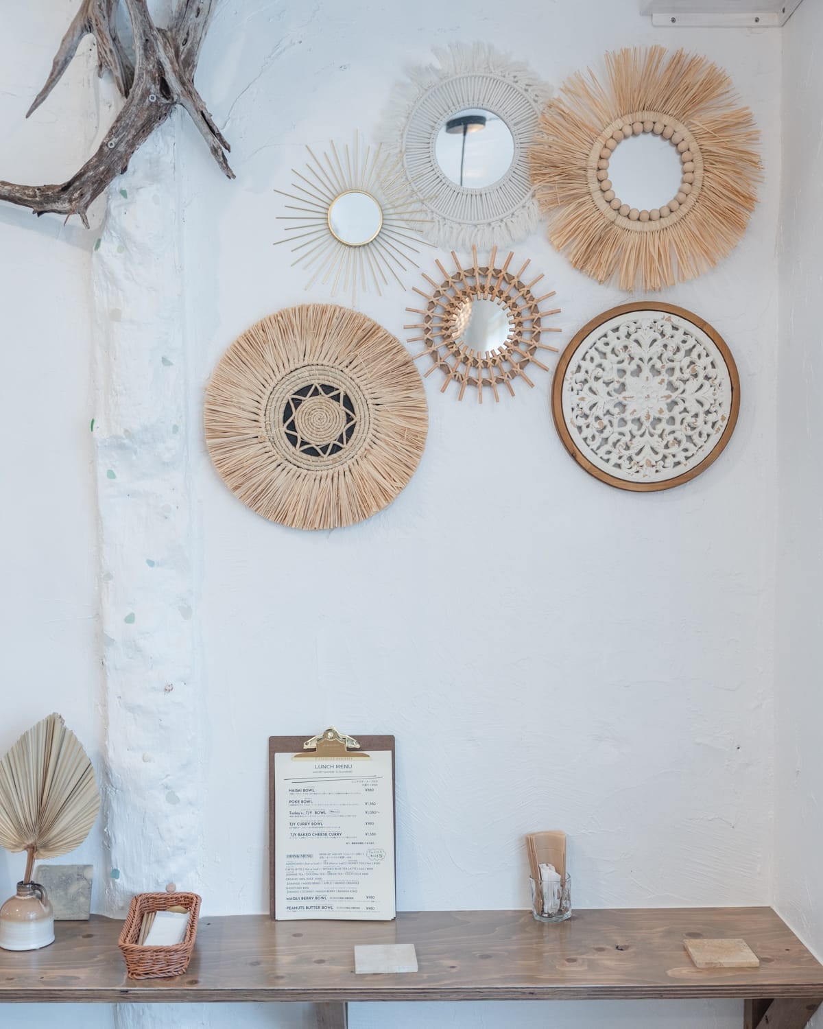 木のテーブルや椅子がドライフラワーや流木などと調和しながら空間を作っています。