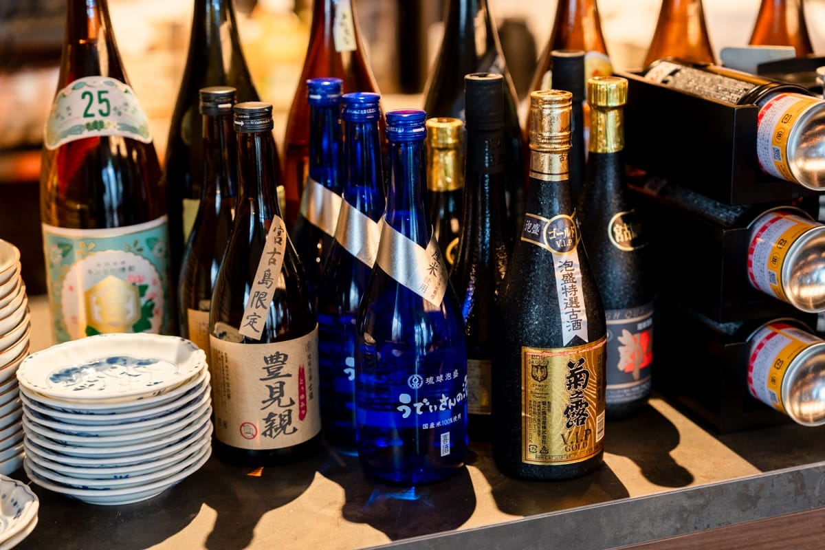 目の前にはずらりと並んだ日本酒と泡盛のボトルたちが出迎えてくれます。日本各地の名酒から、沖縄の伝統的な泡盛まで、そのバリエーションは実に豊かです。
