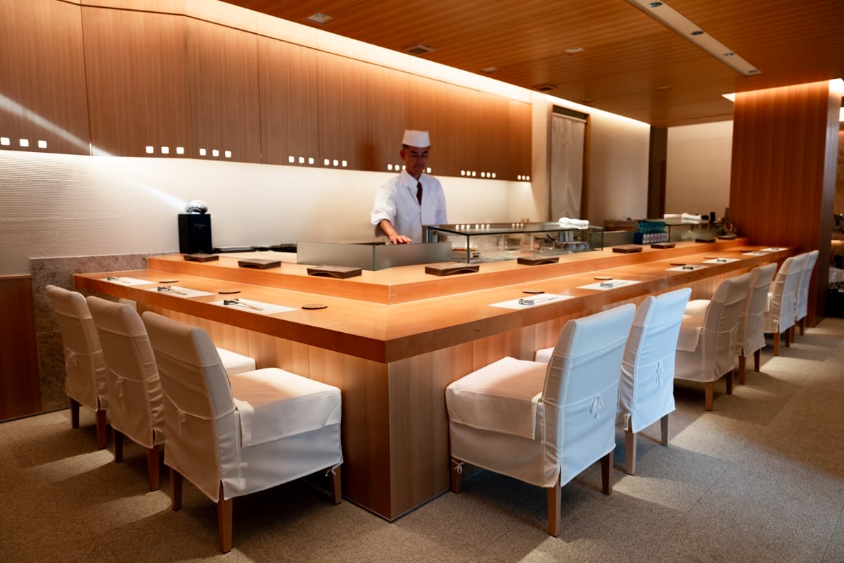 一歩足を踏み入れると、大きなカウンターの奥で職人が待ち受ける、高級感漂う空間が広がります。こちらの席では匠の技を目の前で楽しむことができますね。
