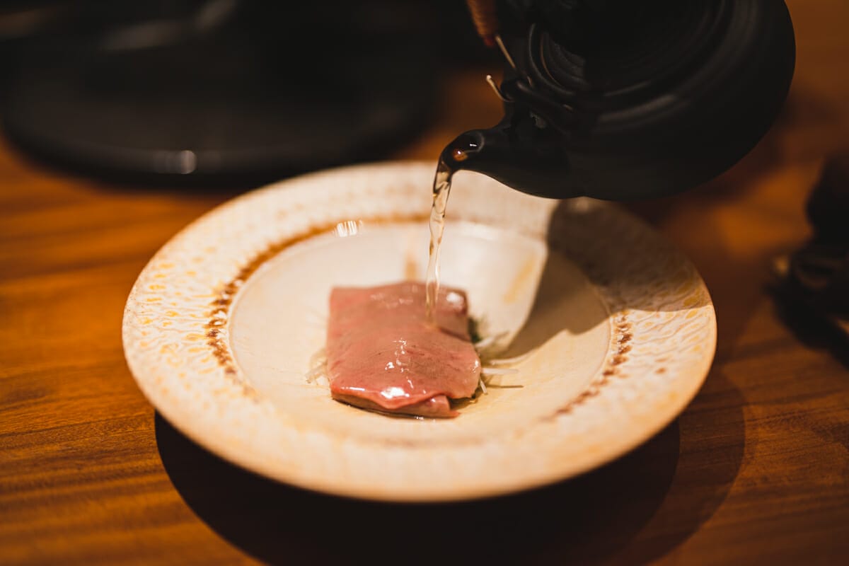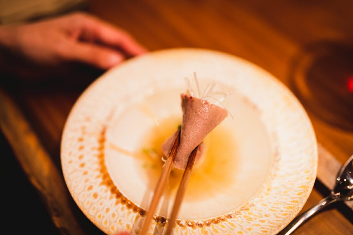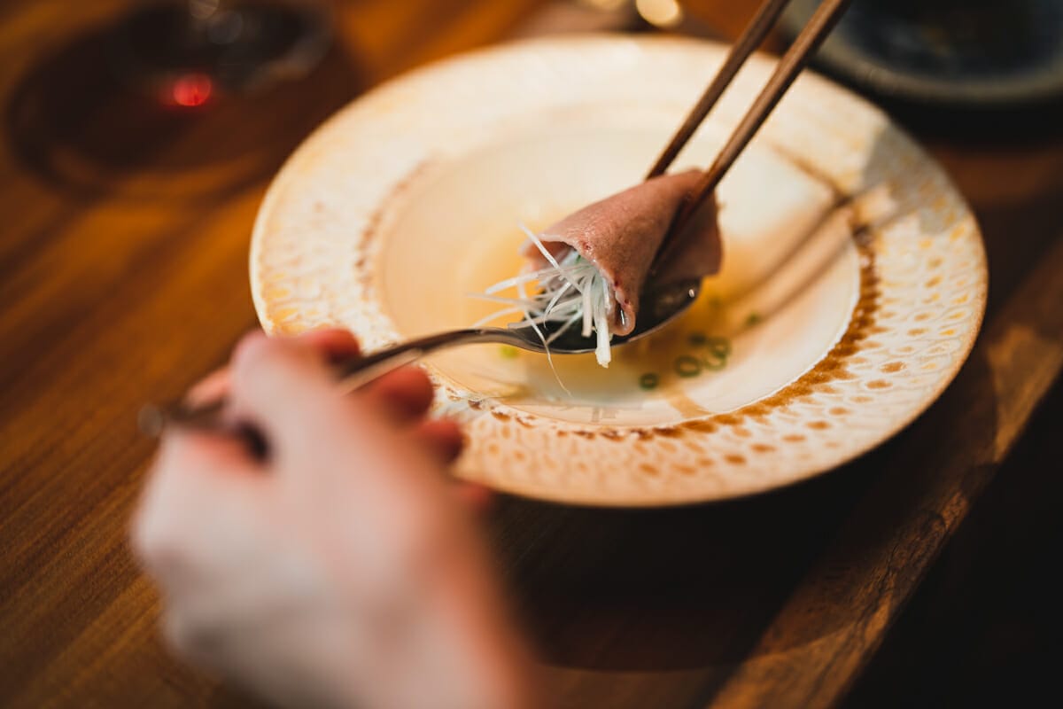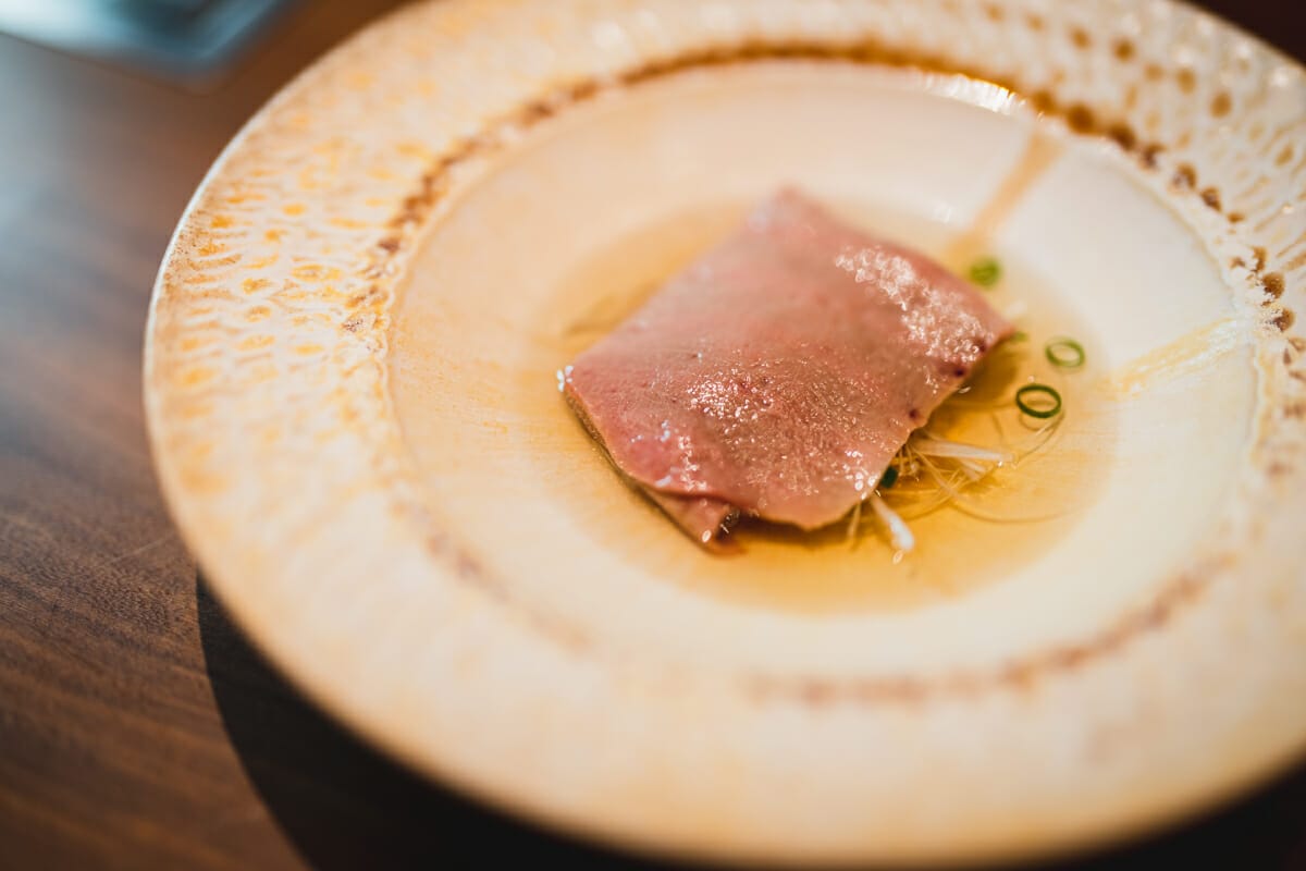 宮古島産カツオのお出汁で食べる半生タン