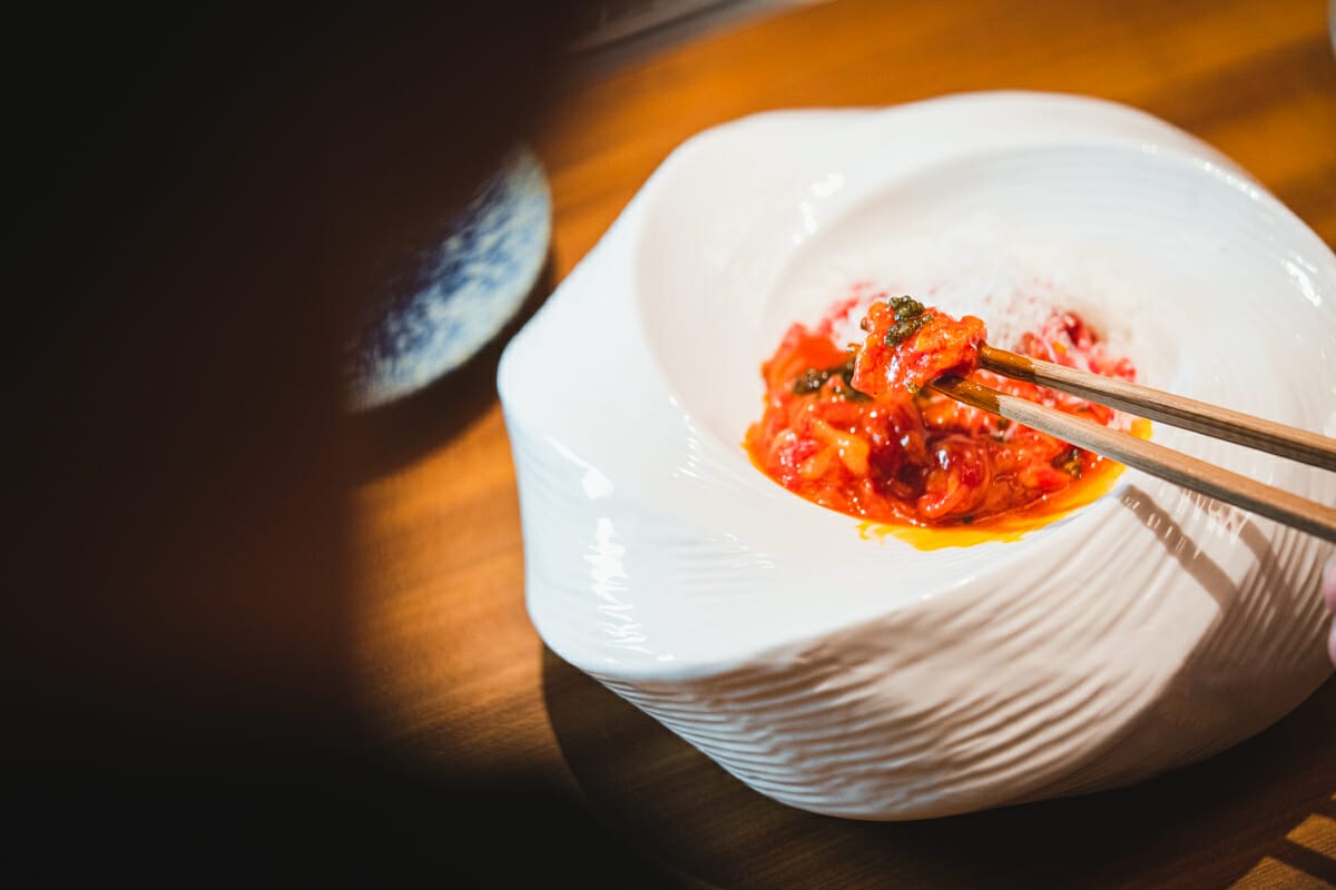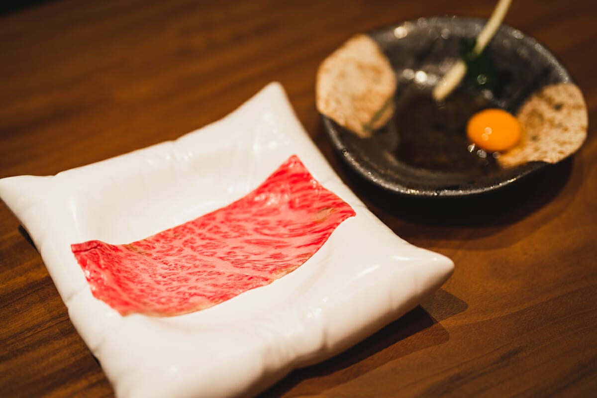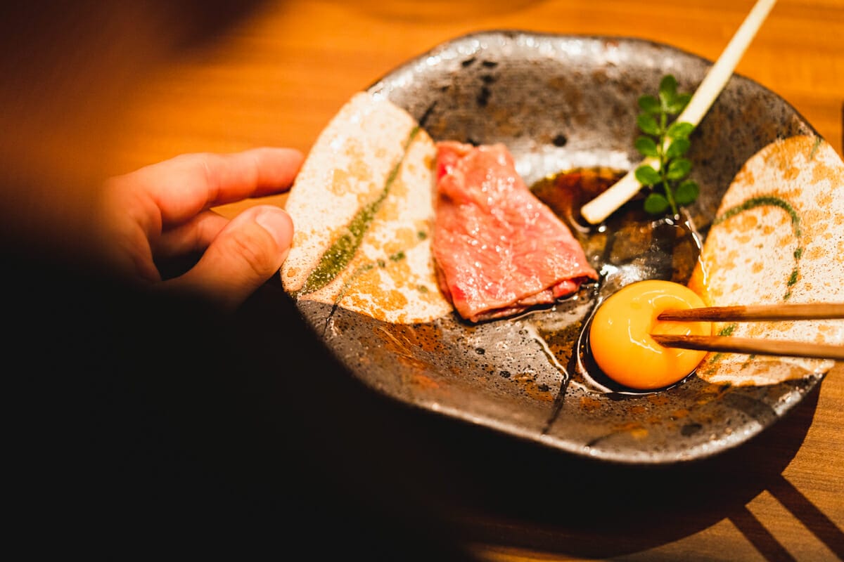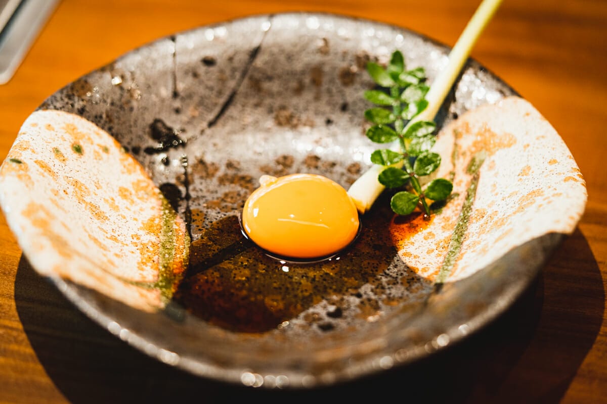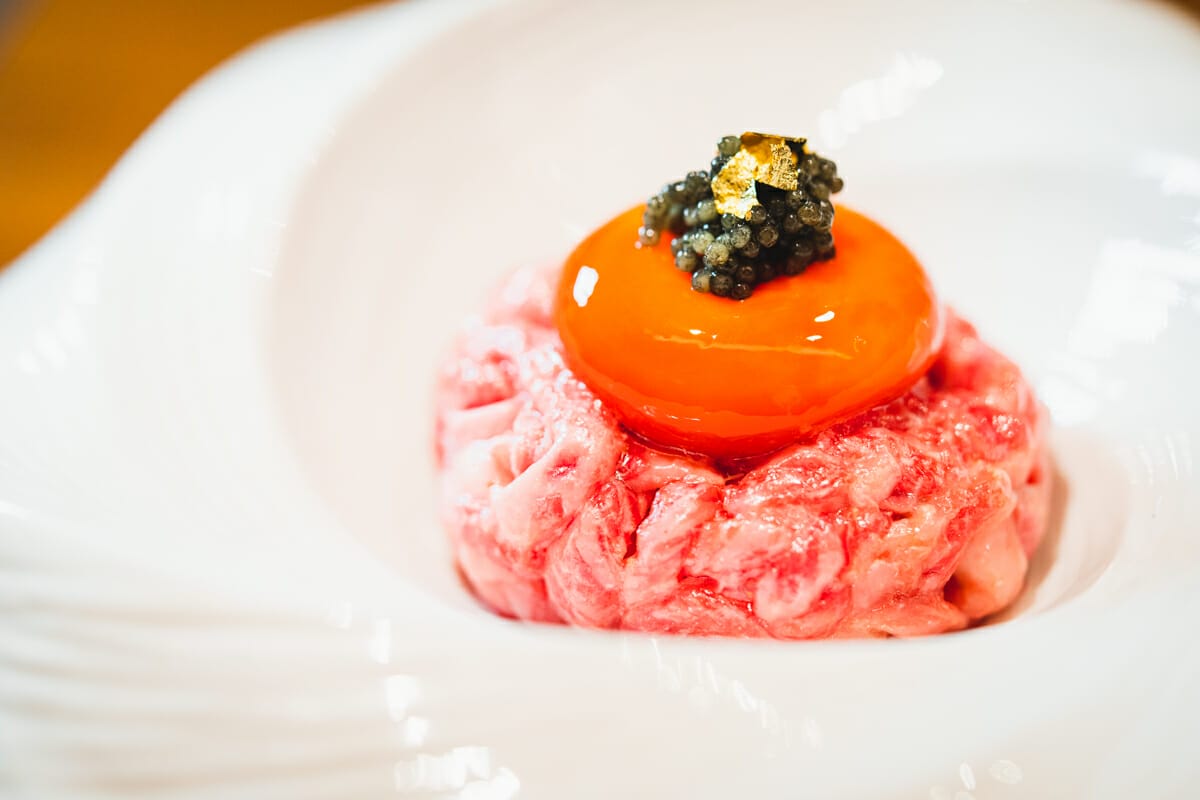 生肉の上には漬け卵、キャビア、金箔が乗っています。