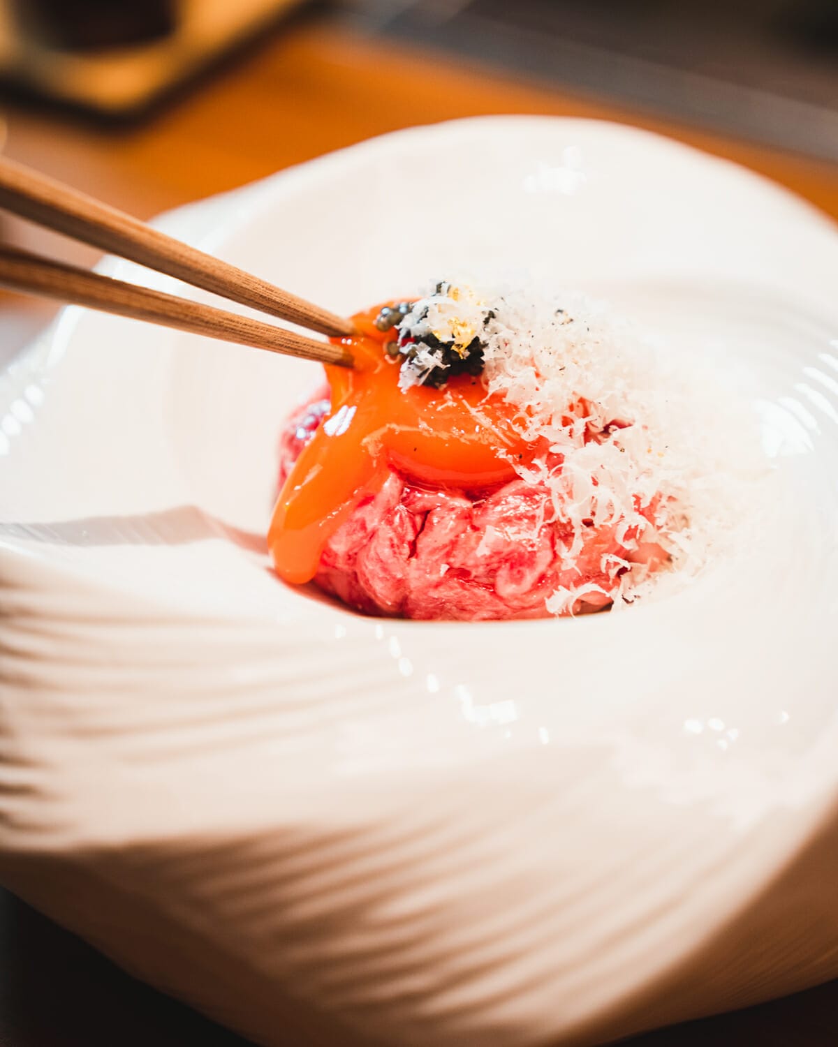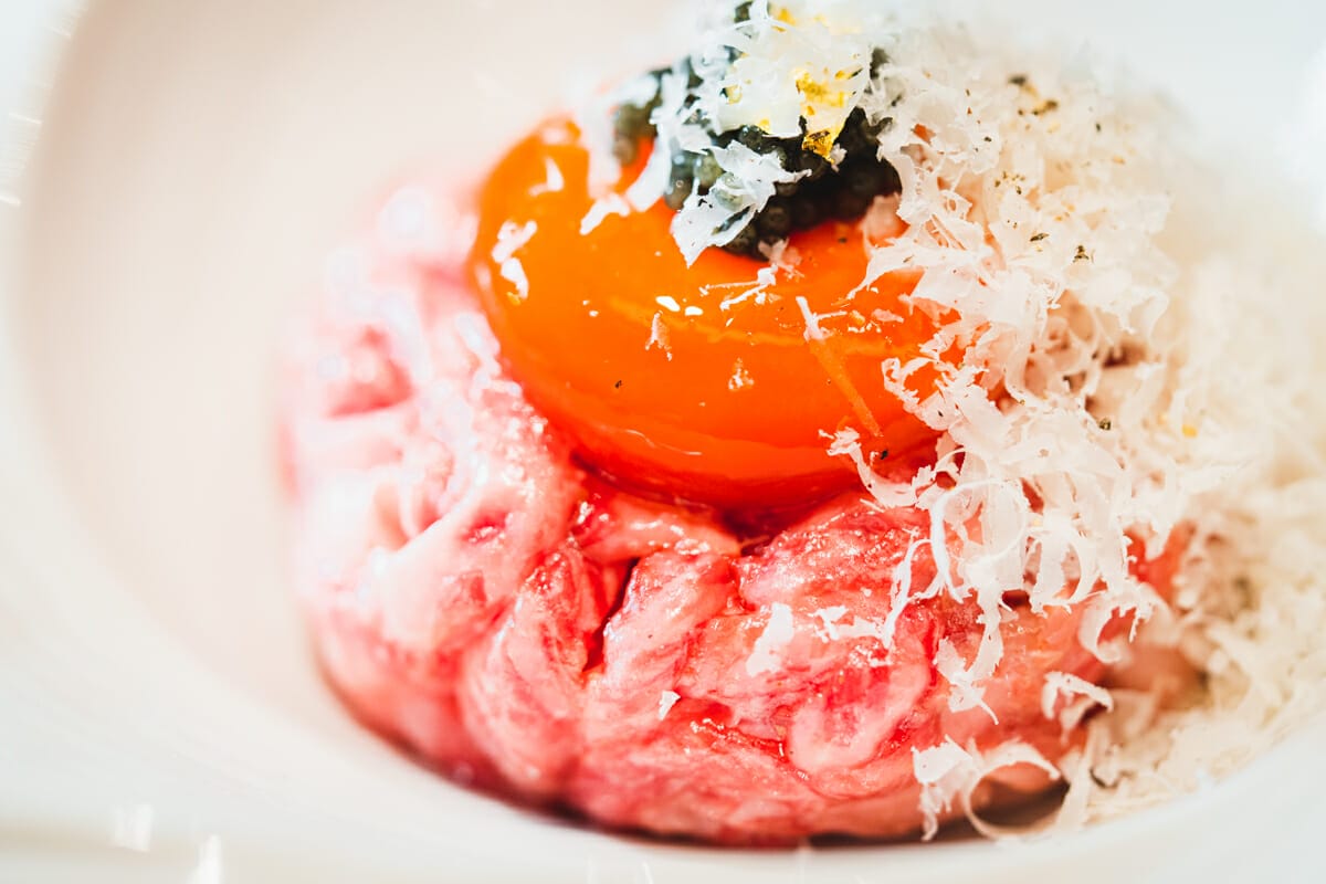 最初はチーズなしで混ぜて頂きます。肉質はとても柔らかく、口の中でとろけます。上質なうまみと、霜降りのバランスが絶妙です。キャビアの塩味も丁度良く、ワインが進みそう。次にチーズも混ぜて頂くと、更にコクが出てくるので奥深い味わいに。