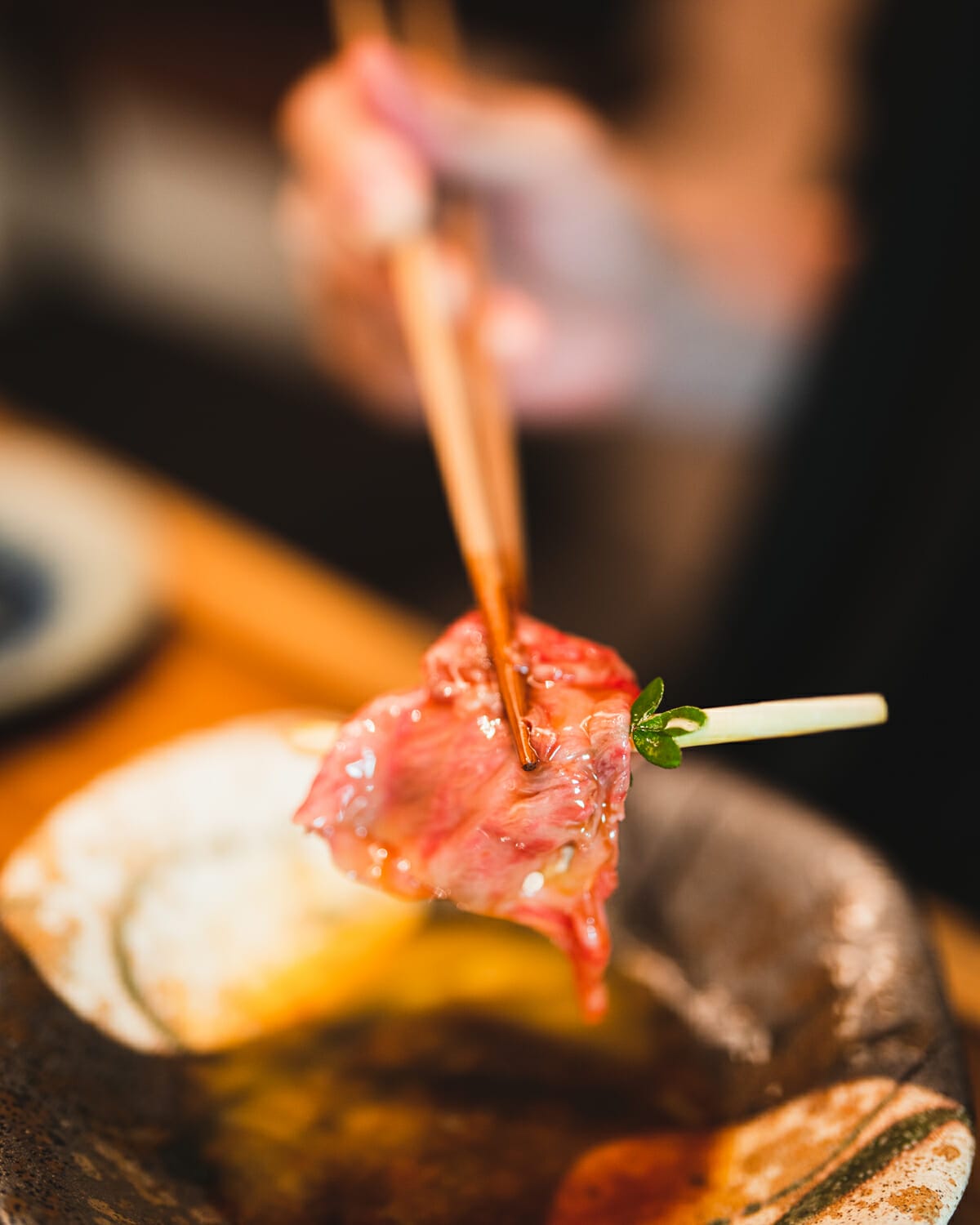 お肉に島らっきょうと琉球山椒を巻いて頂きます。