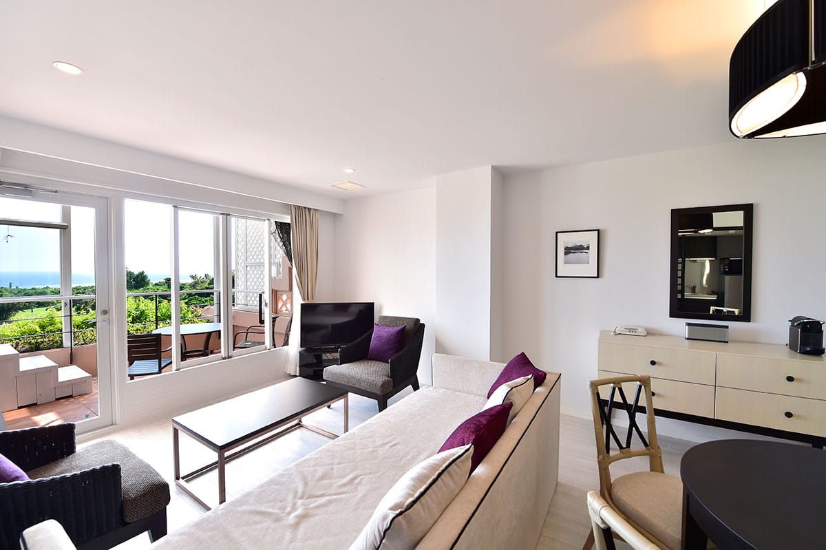 ■宮古ブルーの海を独占するジャグジーと、長期滞在に最適なキッチンと洗濯機つきの客室