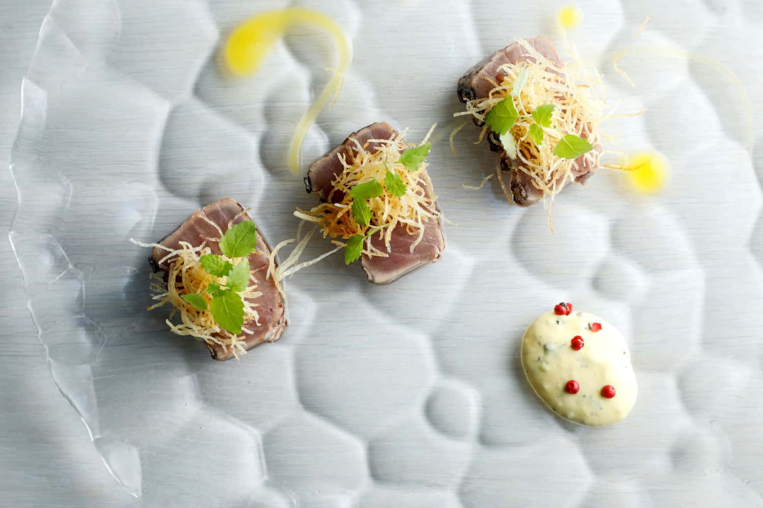 ご滞在中のお料理には、料理長大橋進が紡ぎだす琉球の技法を融合させたイノベーティブなフランス料理を、ホテル内レストラン「TIN’IN」にてご用意。鰹漁の盛んな伊良部島産の鰹を使ったシグニチャーメニュー「鰹のミキュイ」や季節の野菜をアレンジした「島野菜パフェ」など、島を素材から感じる唯一無二の食体験を提供いたします。