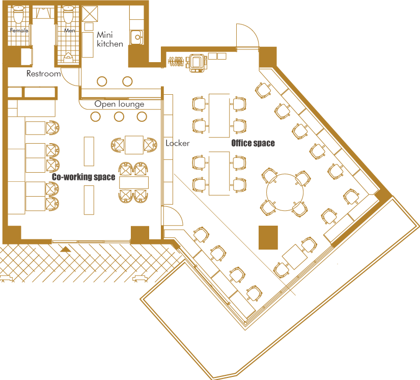 店内は、シェアオフィスエリアとコワーキングエリアに別れており、様々な用途に応じて利用できる作りになっている。