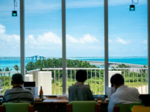 施設中央では、BBQを楽しめる。開放的な空間で食べる食事は格別!提供するメニューは、こだわりのサーロインステーキやスパムなどを盛り合わせたBBQプレート!宮古島の海に映えるオシャレなドリンクもご用意。また、キッチンカーでインスタ映えまちがいなしのガーリックシュリンプやアヒポキ丼も提供する。