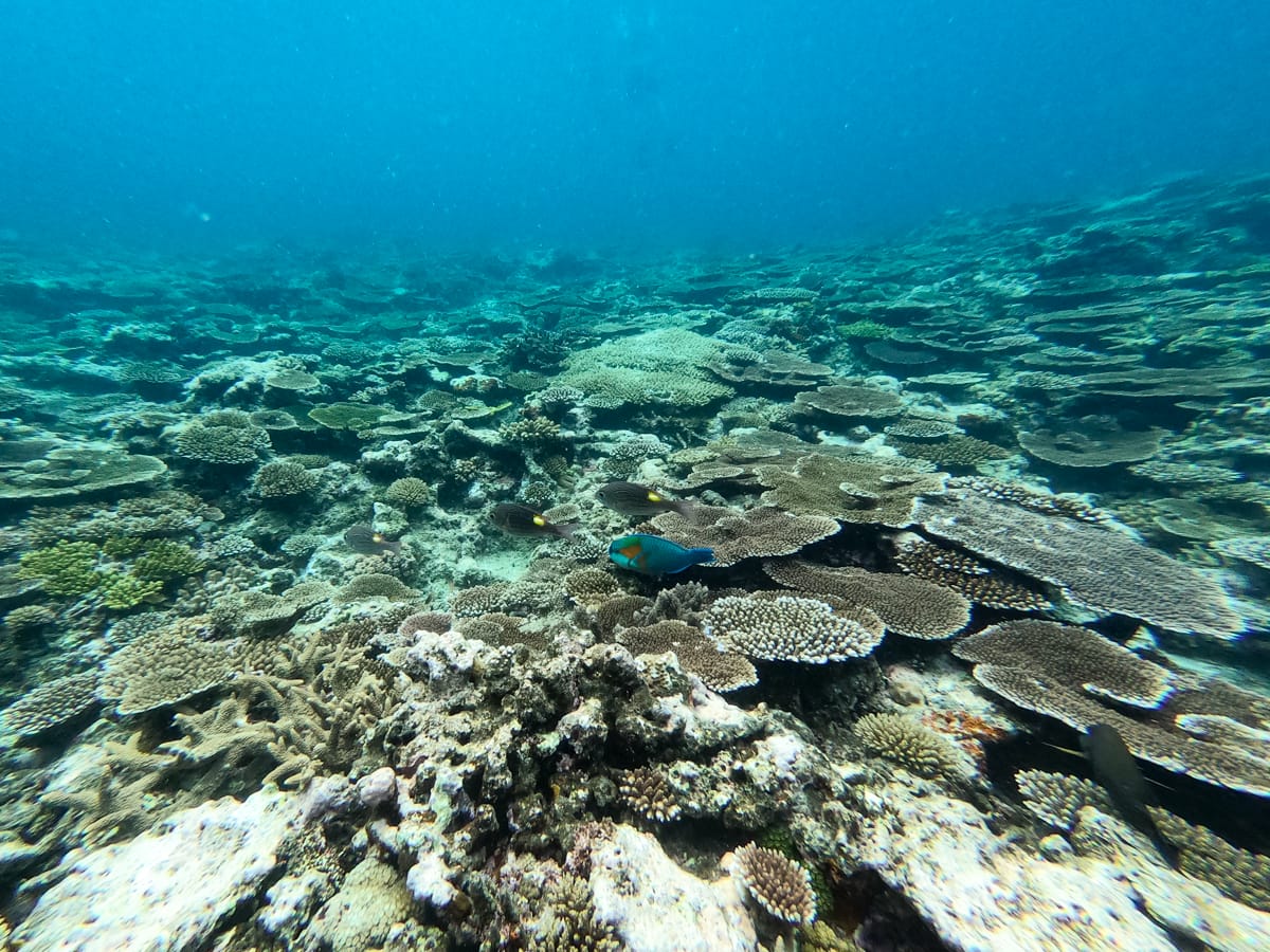 橋をくぐってこの海の色に感動していたところ、本日の1本目のポイントにつきました。ここはまだ八重干瀬ではないのですがお魚がたくさんいたり、サンゴが綺麗に残っているポイントです。