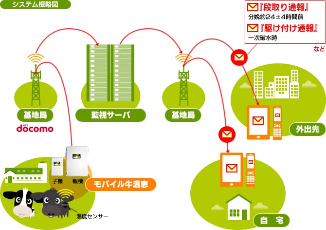 モバイル牛温恵は、親牛を温度センサーで監視し「分娩の約24時間前」「1次破水時」「発情の兆候」を検知しメールでお知らせする、畜産農家の方のためのシステム。これまでのように、人海戦術による24時間体制での監視の必要がなくなり、精神的にも穏やかで、計画的な分娩や発情時期を迎えることができるのが特徴。(モバイル牛温恵の公式サイトより)