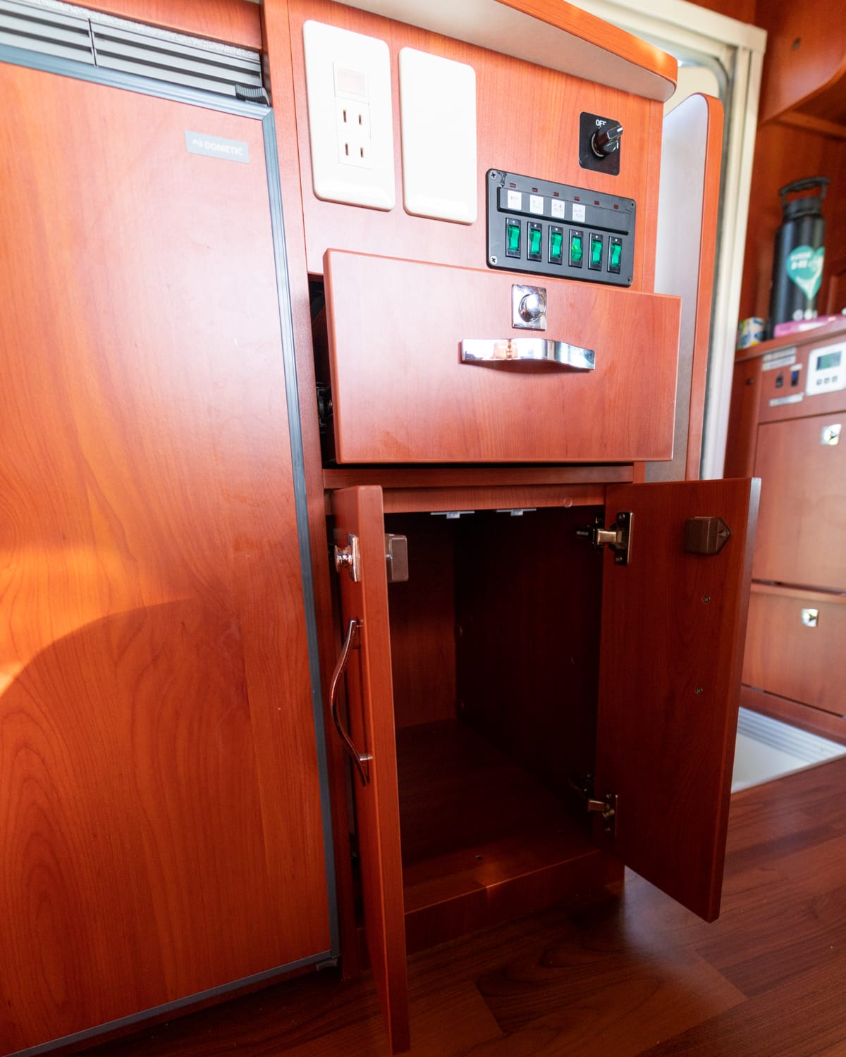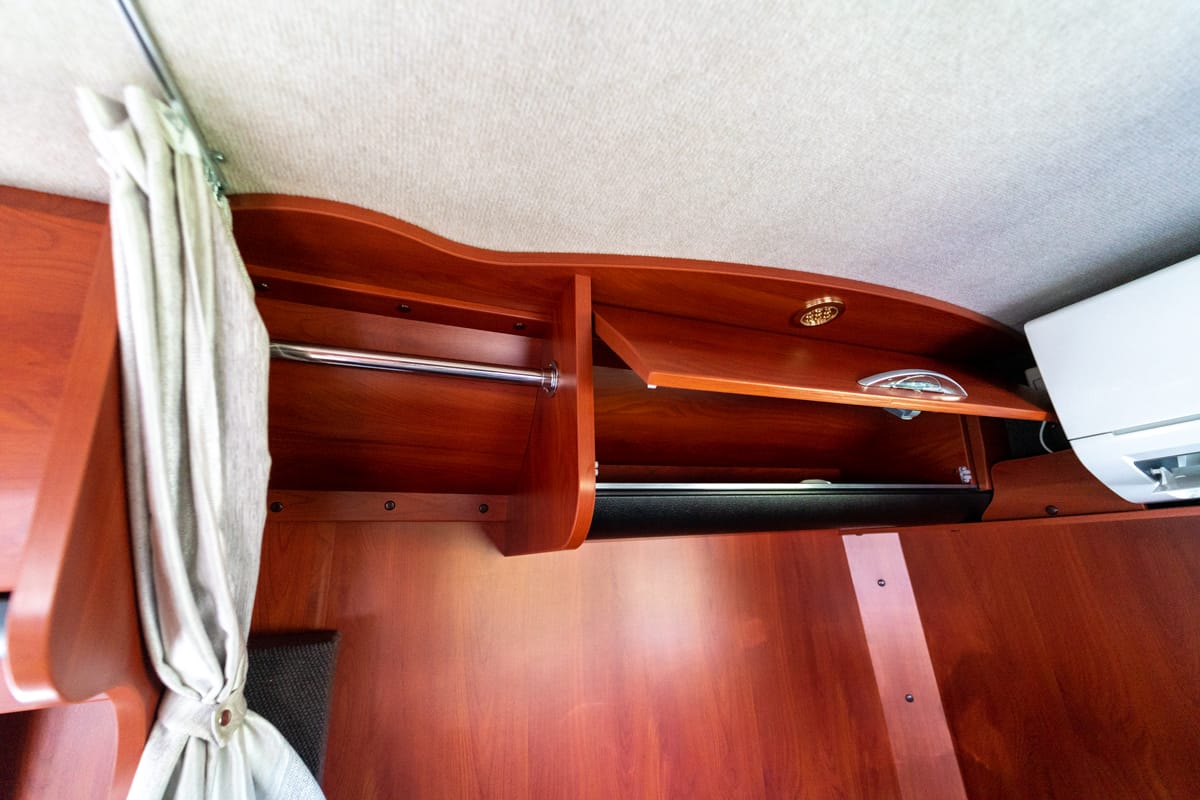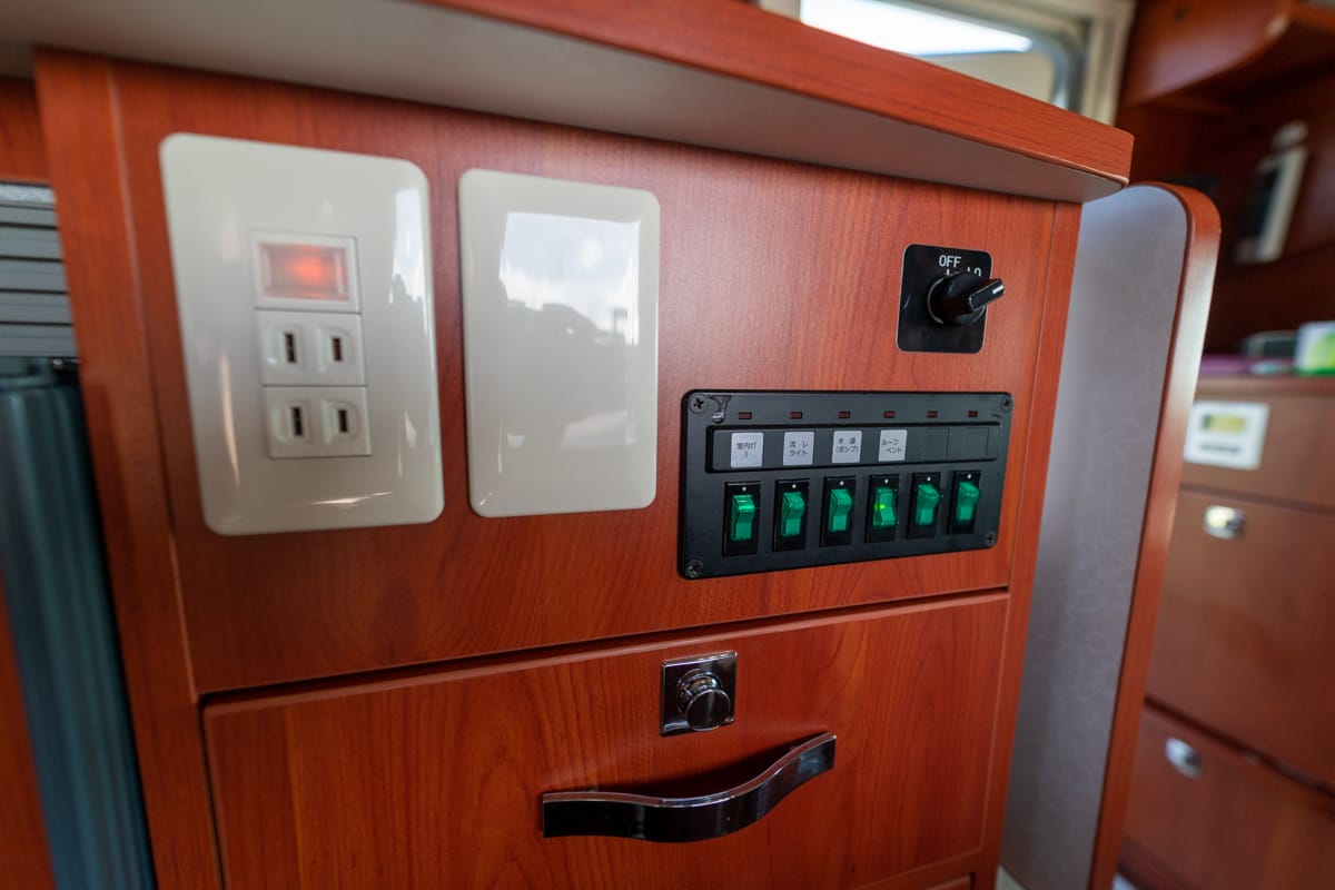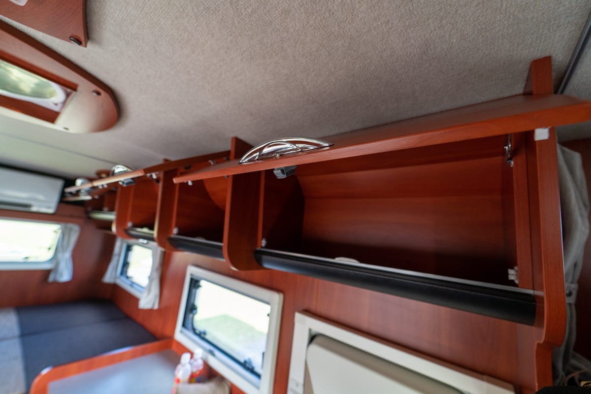 たくさんの収納スペースがあり、長期滞在する際にはとても助かりそうです。その他、後部ベッドの下のスペースは収納庫なっています。かなり広く、人も入れます。外からでも中からでも出し入れ可能なのでとても便利です。