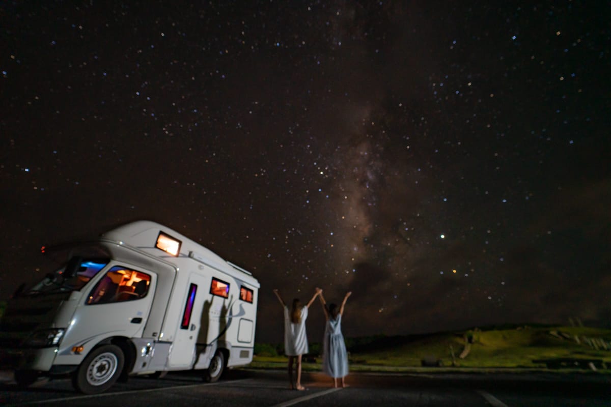 満点の星が降り注ぐ中、心地よい夜風に当たりながら語らうのも良い時間です。夜更けまで星空を堪能した直後にすぐ寝られるなんて、キャンピングカー最高!