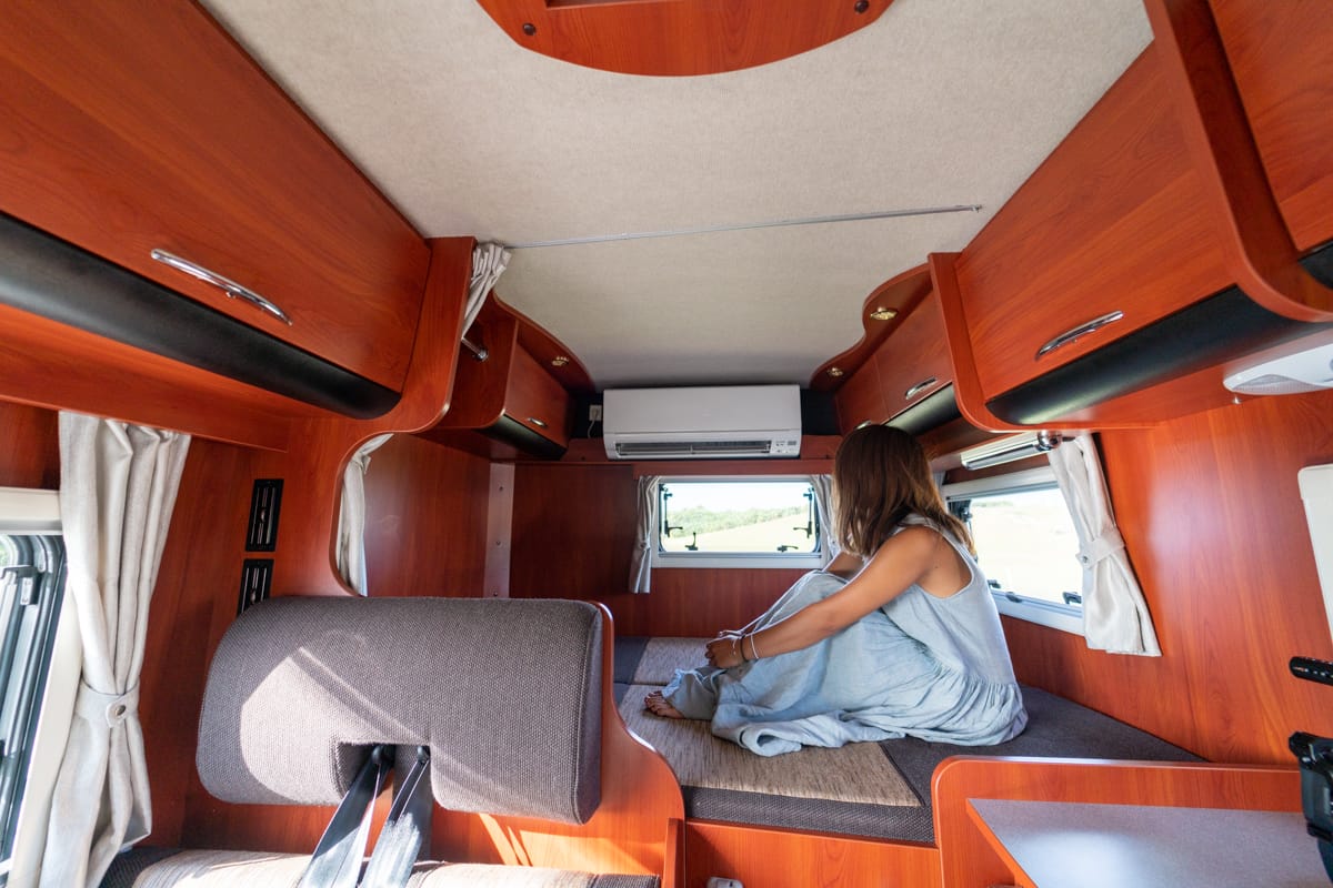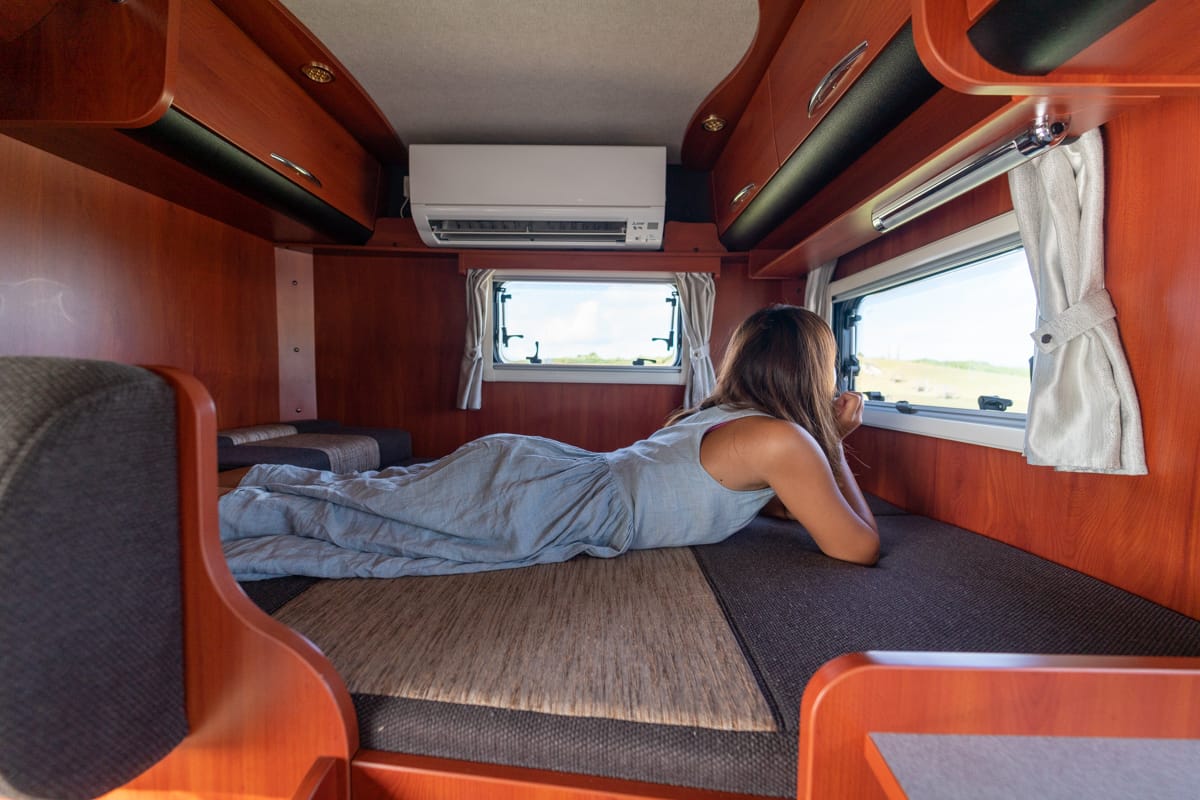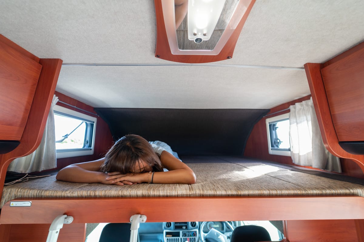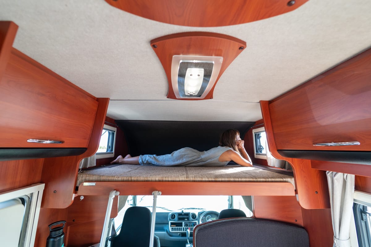 運転席の上にベッドがあり、こちら2名が余裕で就寝可。横を向いても縦になっても足は伸ばせます。かなり広々です。